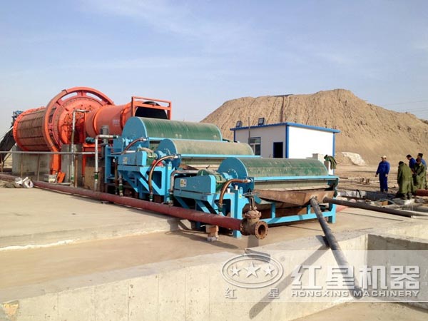 工藝配置:軸承傳動(dòng)節(jié)能型球磨機(jī)、螺旋分級(jí)機(jī)、磁選機(jī)(采用一次粗選,三次精選的磁選工藝流程)、永磁過(guò)濾機(jī)